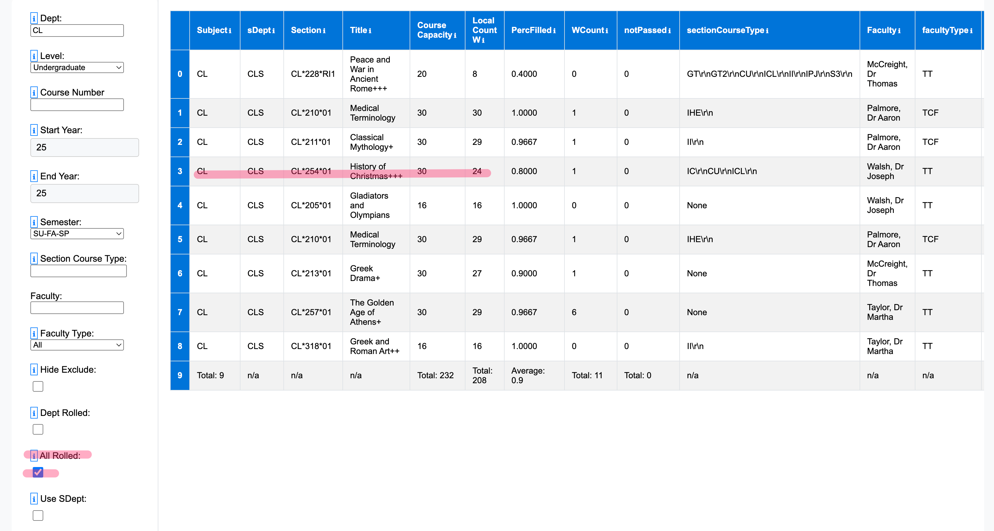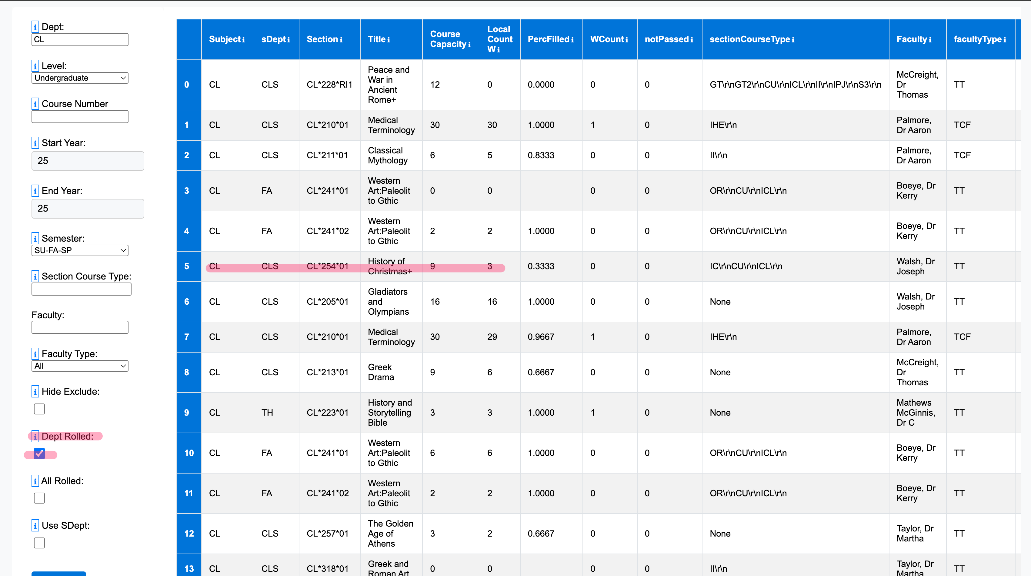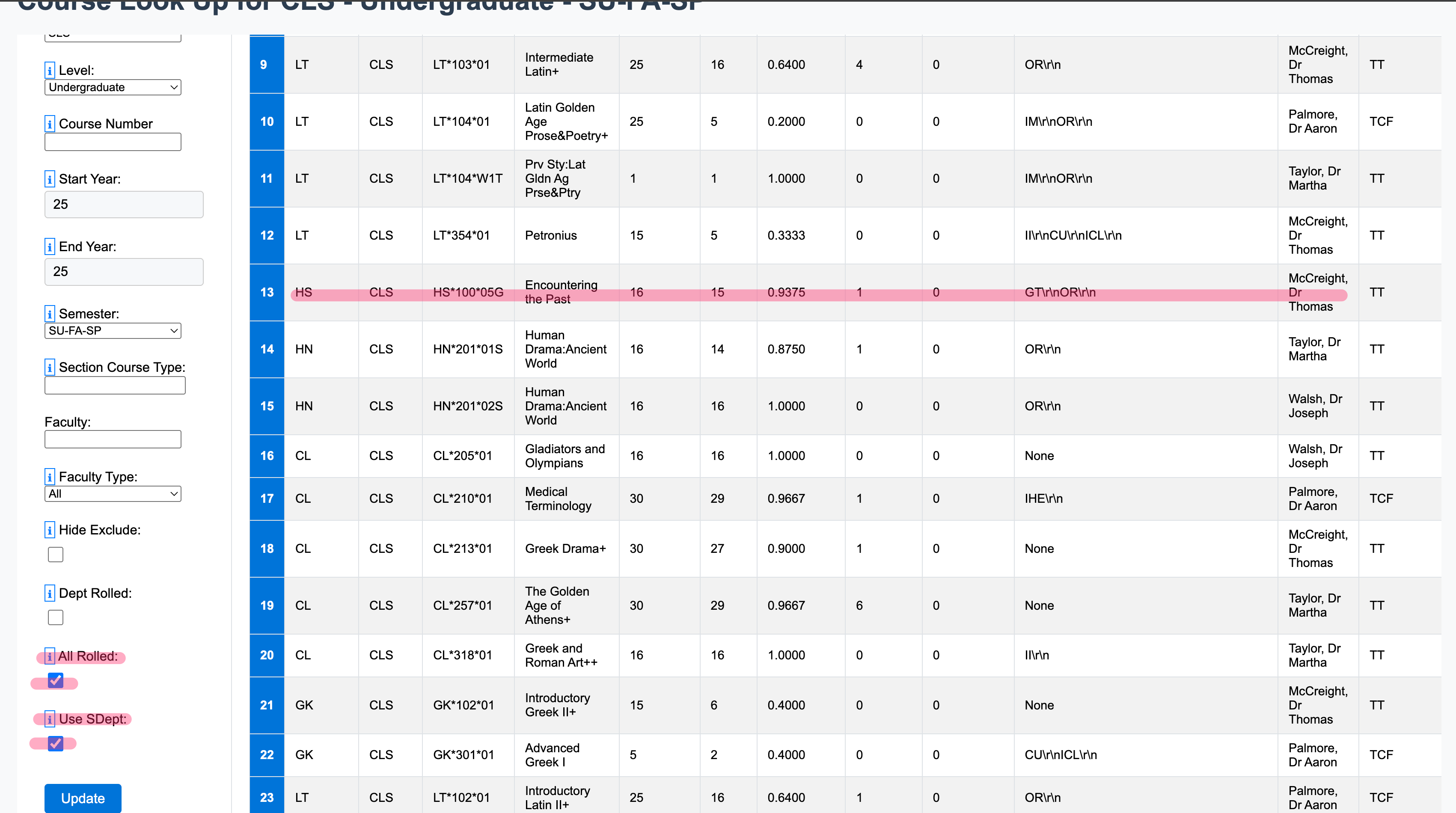 In the above we can see that "HS-100-05G" while not cross listed with classics at all, and therefore offering now classics seats, was still taught be a member of the classics department. Through this perspective the costs and revenues of this section can be included in the totals for the classics department.