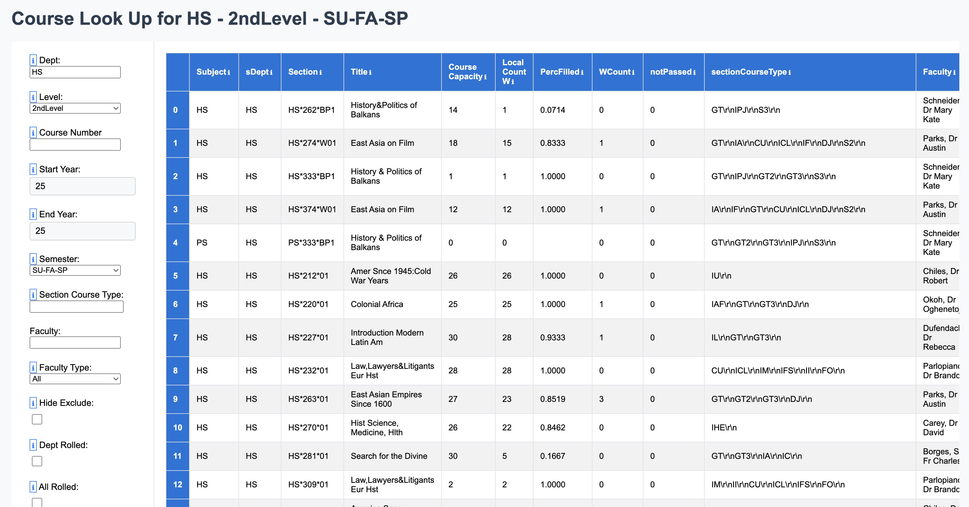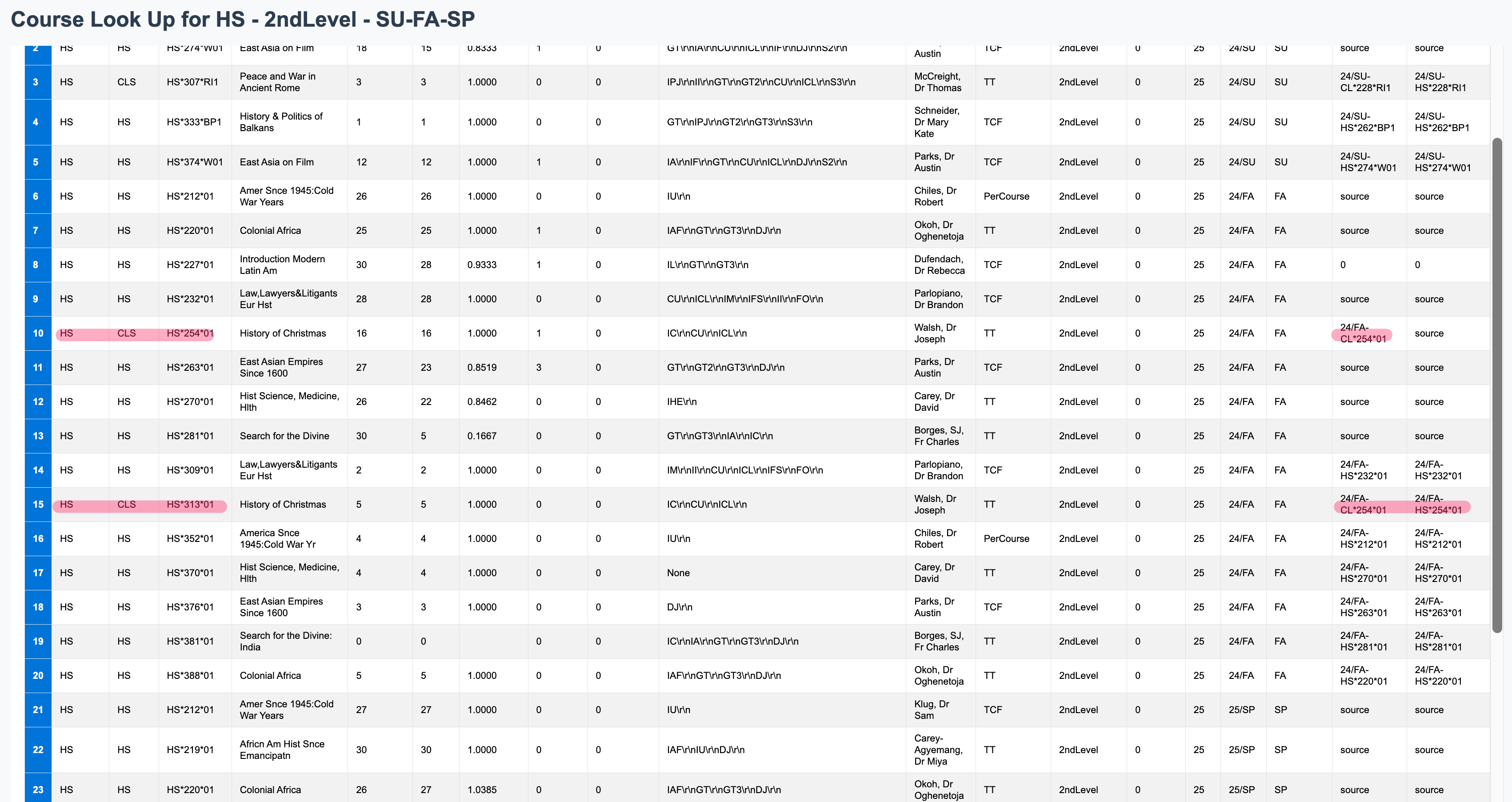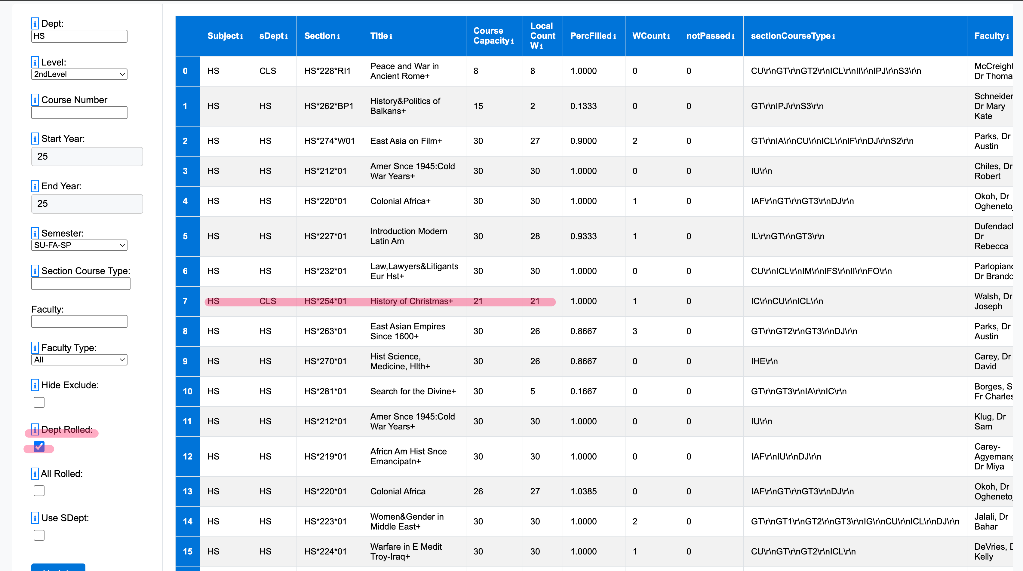 History is a special challenge here because it has several sections that are cross-listed within the department and also cross listed with another department.